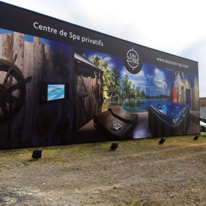 Pour l’extérieur, les supports souples les plus utilisés sont les bâches en PVC imprimées. Elles peuvent être simple face, recto/verso, ou micro-perforées pour les grands formats ou les endroits très venteux. L’impression se fait en quadri. Pour la découpe, elle est généralement de forme assez simple : rectangle, trapèze ; et parfois avec des découpes intérieures, pour passer la tête dans le cas d’un photobooth, par exemple. Concernant les finitions, un grand choix s’offre à vous : renfort périmétral, œillets, fourreaux…